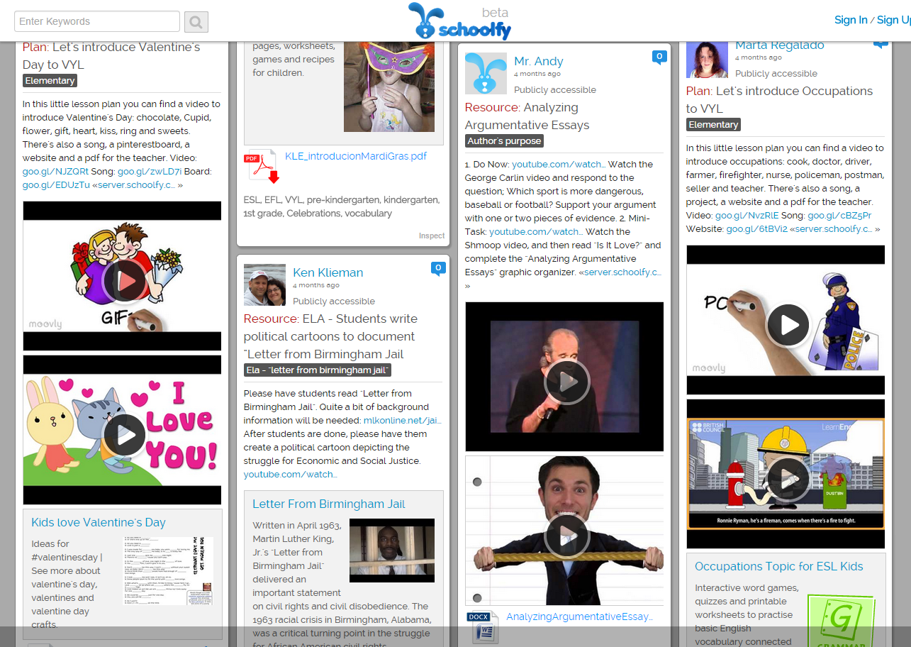 In 2013-2014, we applied this technology to develop the Beta version of Schoolfy. The original intent was to develop a lesson-centric learning system where every lesson was its own micro social network. At the top-level, the Schoolfy presents a wall similar to Pinterest’s, but the actual “posts” are closer in functionality to Tumblr’s. Here is a screenshot of the wall: