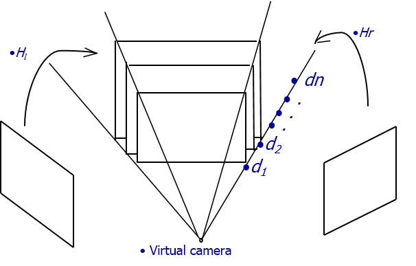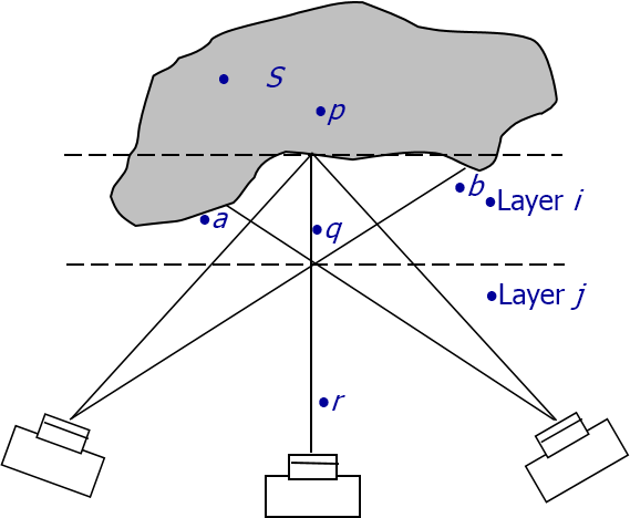 - 3-D range space is quantized into constant depth layers at each new viewpoint
