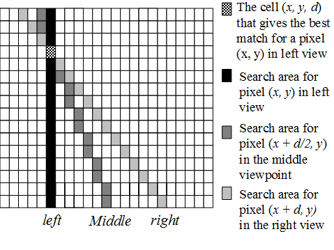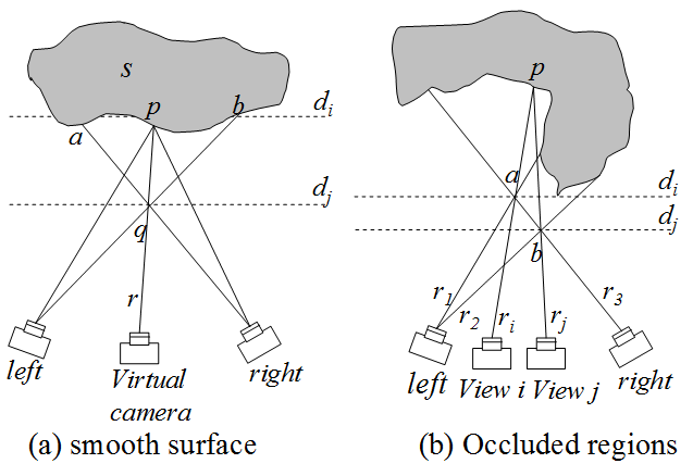 Note that that Step 1 is different from traditional stereo: the range space is first discretized into a fixed number of planes. The depth may not be correctly computed in this way. However, the rendering is good because the correct color is picked for each pixel: