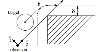 where c and m are constants, ro is the distance to observer to the corner causing the occlusion at said free edge, and h is the distance along the corresponding path in the escape tree. Minimizing ro increases the observer’s ability to track in the future, whereas maximizing h decreases the current likelihood that the target escapes.