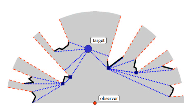 Every path along the escape tree represents the shortest escape path (SEP) between the current target position and a free edge in the observer’s visibility region. The length of a given SEP is the shortest distance to escape (SDE) through the corresponding free edge.