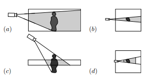 People often walk along a flat surfaces and the projection of the scene visual hull onto this plane contains the most useful information for counting and bounding the location of people. The figure on the left shows how this projection is computed. A measured silhouette at each camera sweeps a cone in 3-D space which is flattened onto a plane. The side view of a camera looking at a person is depicted in (a). The shaded region is a cross-section of the 3-D cone formed by the silhouette of the person. This cone is projected onto the plane as seen from the top in (b). The shaded area in (b) represents the projected visual hull from one camera. (c) and (d) show the projection for a camera not oriented horizontally.